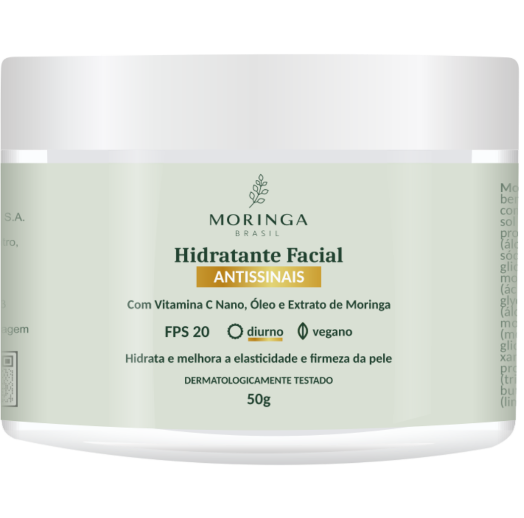O Hidratante Facial Antissinais Diurno com FPS 20 Moringa Brasil combina o poder antioxidante do Óleo da Moringa Oleifera e da Vitamina C nano com o extrato nutritivo das folhas desta planta, numa fórmula hidratante capaz de prevenir o surgimento das linhas de expressão, atenuar as rugas mais profundas e aumentar a firmeza e elasticidade da pele.